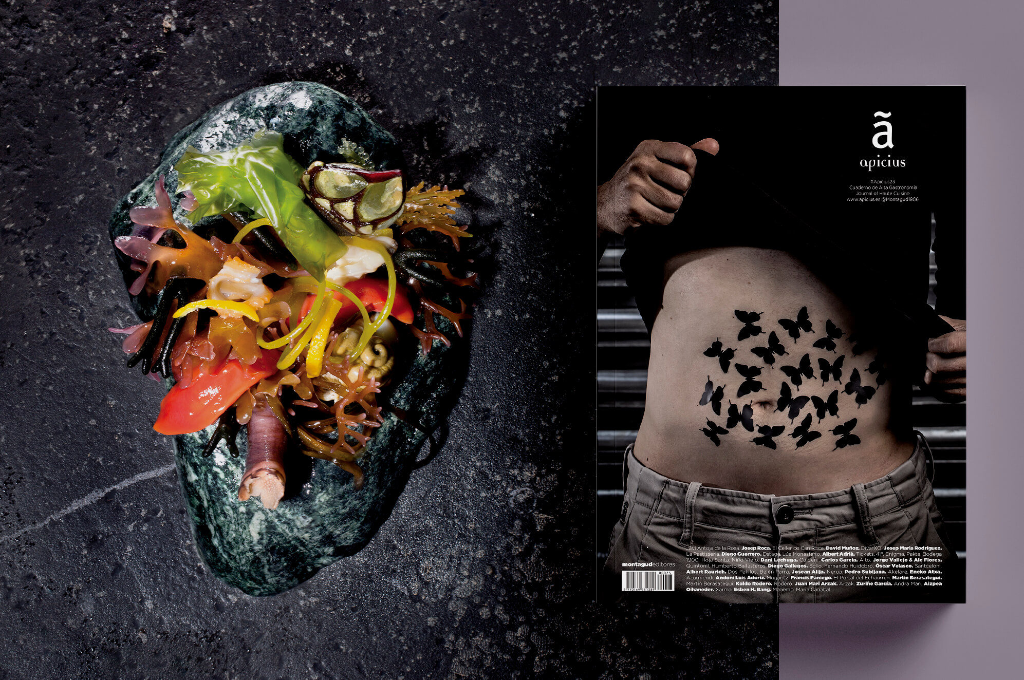 El Cuaderno de Alta Gastronomía detalla por primera vez en la Historia algunos de los lienzos más significativos de DiverXO. “Las mariposas en el estómago expresan una sensación ante lo nuevo, un estado de ansiedad buena”. Apicius 23 toma estas palabras de David Muñoz y destapa, desde la portada, toda la emoción que entraña la cocina contemporánea. Cada una de sus 224 páginas lo consigue gracias a 21 aliados excepcionales: 19 cocineros, que suman un total de 35 estrellas Michelin junto al Campeón del Mundo de Pastelería, Josep Maria Rodriguez, y a Josep Roca, al frente de la bodega y la sala de El Celler de Can Roca. El sumiller ha escrito un brillante artículo para el número del Cuaderno de Alta Gastronomía. En él, reflexiona acerca de los valores que deben primar en el mundo de la cocina. David Muñoz es uno de esos 19 chefs.